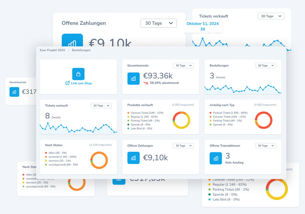 Mit dem festiware Ticketshop behaltet Ihr den Überblick über Eure Ticket-Verkäufe. Unser System bietet eine umfassende Statistik-Ansicht, die Euch in Echtzeit alle relevanten Verkaufsdaten präsentiert. Die Statistiken sind einfach filterbar, sodass Ihr gezielt nach bestimmten Zeiträumen oder Ticketkategorien suchen könnt. Zur besseren Visualisierung sind die Daten in ansprechenden, übersichtlichen Charts aufbereitet – so erkennt Ihr auf einen Blick Trends und Entwicklungen und können fundierte Entscheidungen für Euer Event treffen.
