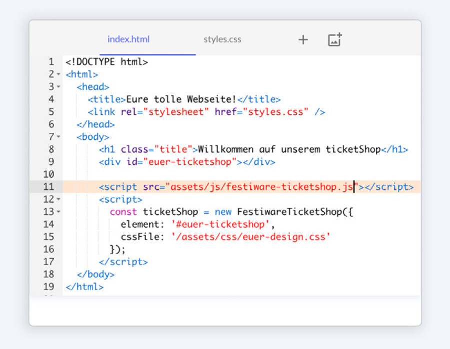 Der festiware Ticketshop lässt sich ganz einfach in Eure bestehende Webseite einfügen – mit nur wenigen Zeilen Code. So integriert Ihr den Ticketverkauf nahtlos in Eure Seite und bietet Euren Besuchern eine komfortable Buchungsmöglichkeit direkt vor Ort.